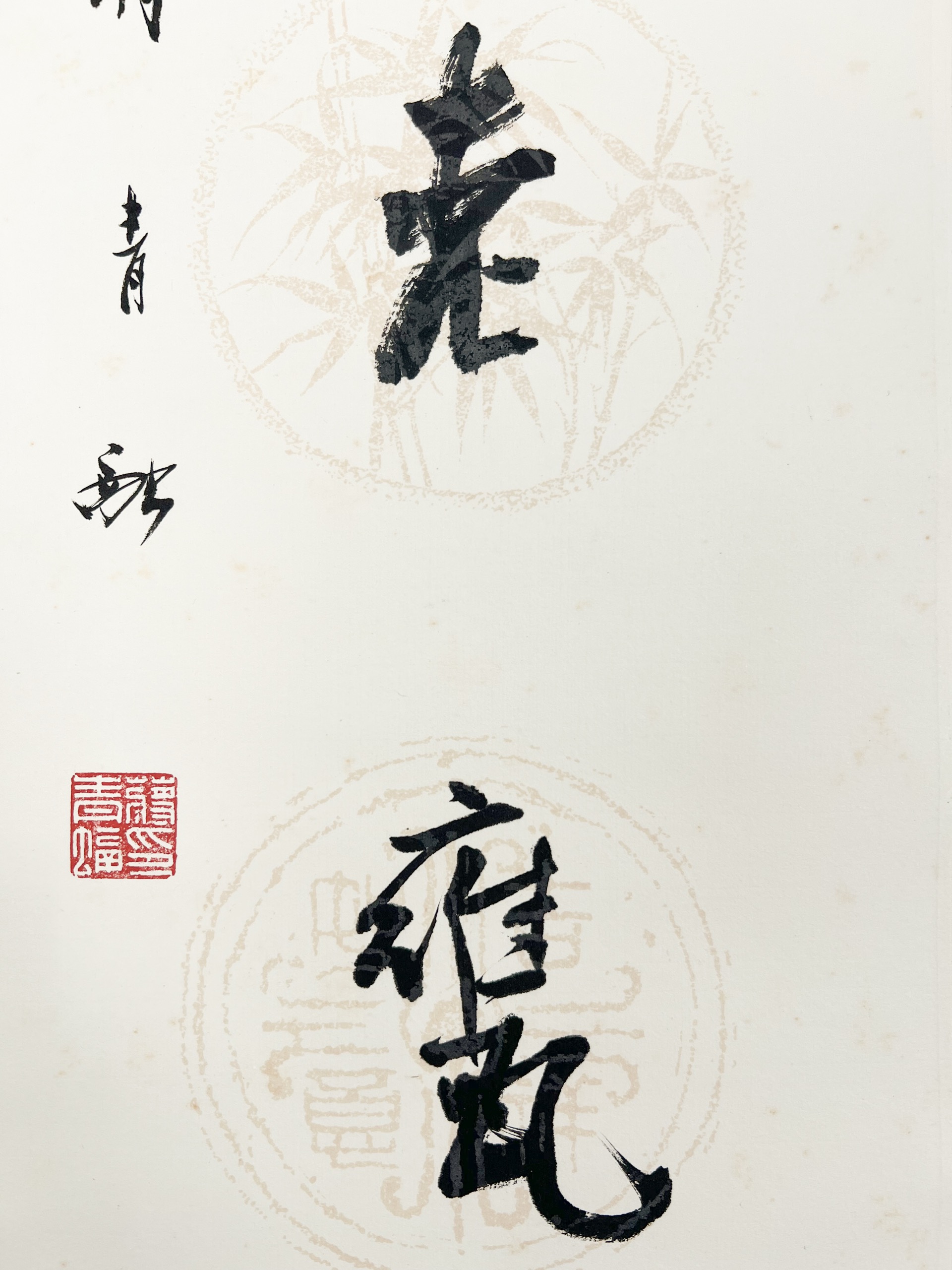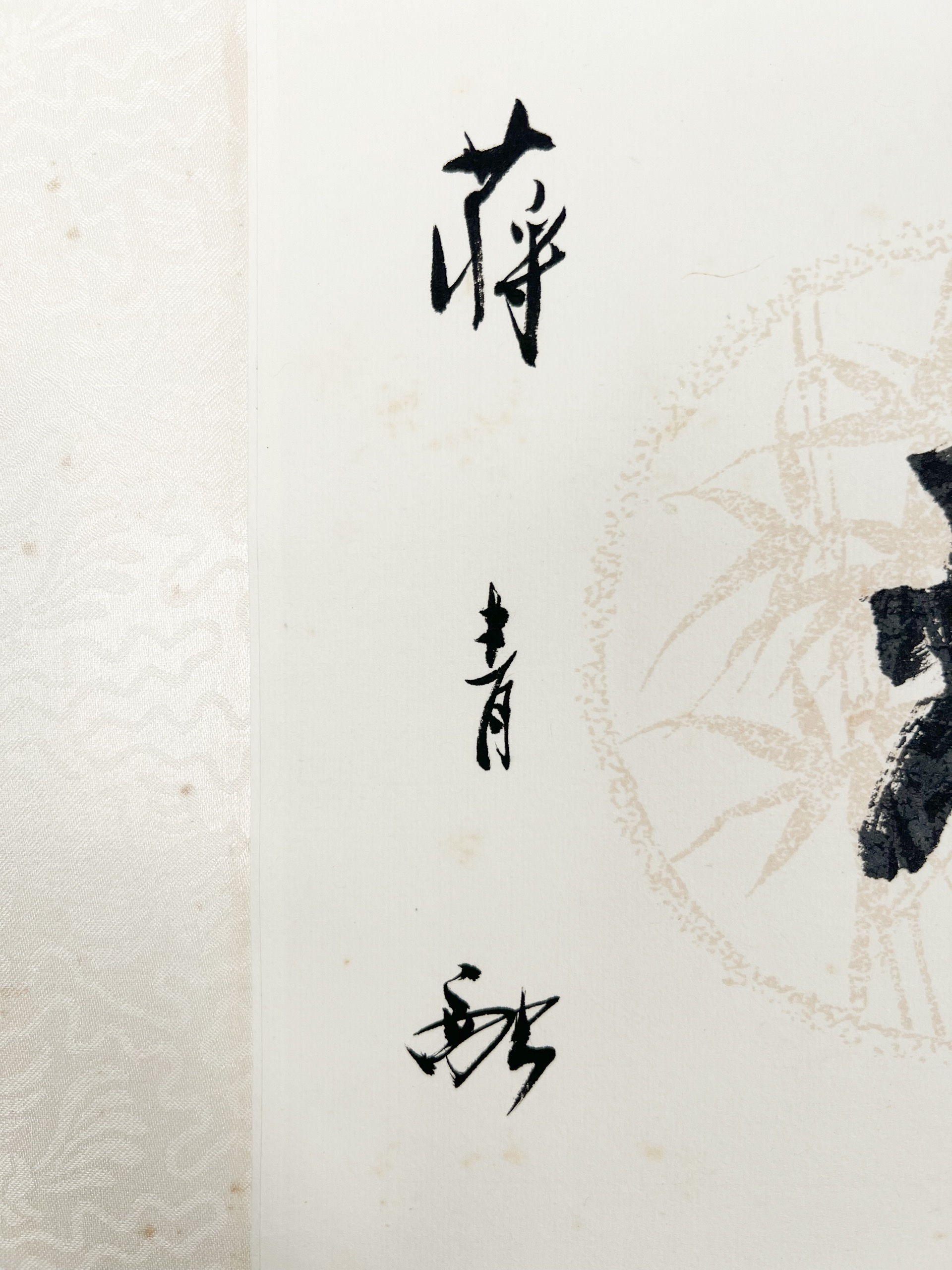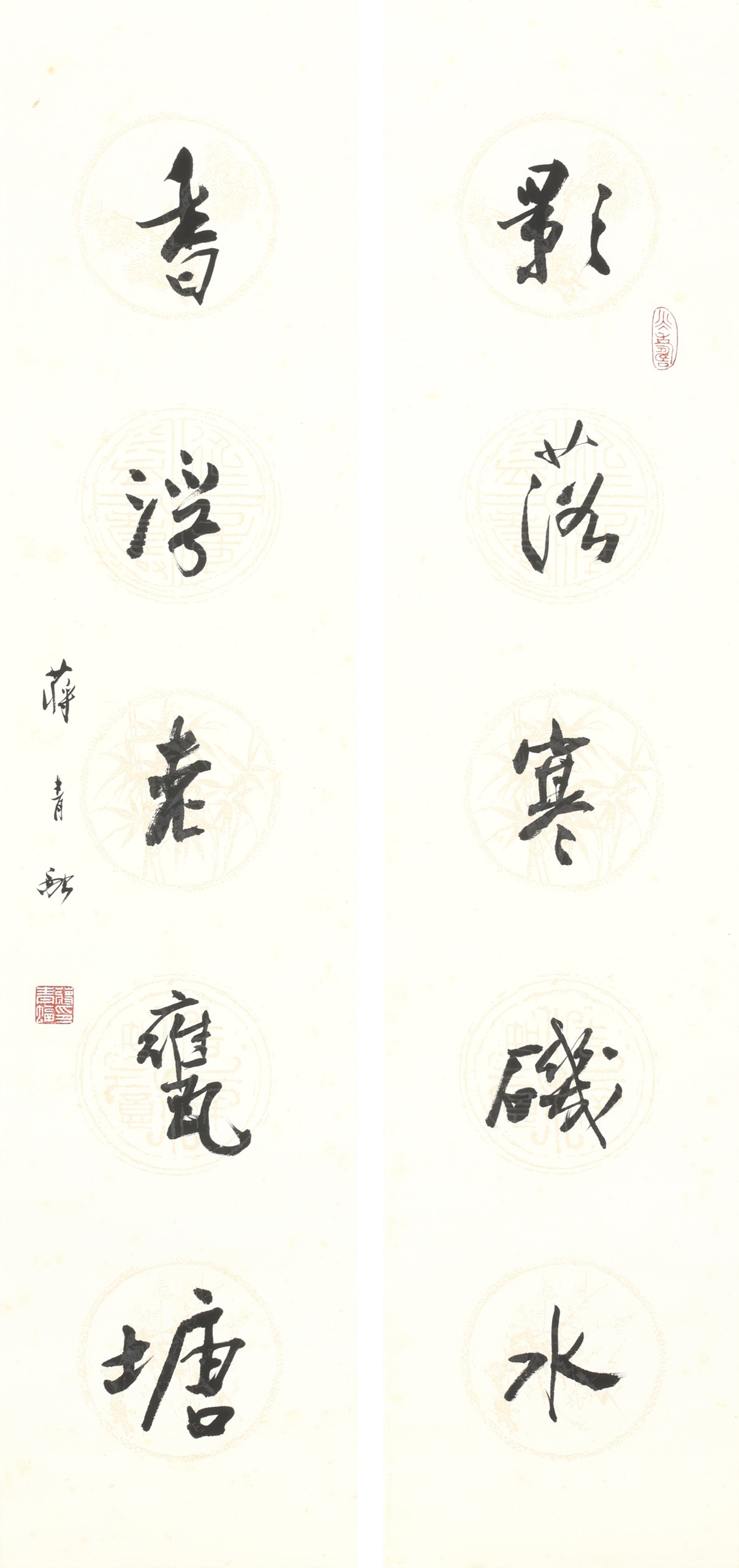 - 蔣青融(1922-2015),湖南常德人,畢業於南京美專,1949年來台,從事美術教育工作,1962年因愛梅而移居梅山。其所繪的梅花,墨韻婉轉迴繞,運筆蒼勁而透顯文人雅逸性情,被人為是海內外墨梅第一人。其書法亦一絕,娟秀筆劃中見力透紙背之疏朗氣勢。此對聯格局別緻,橫豎變化逸出格局,逸趣橫生。國內書家中亦無與之左右者。蔣青融見證書畫相通之理,以及文人精神融入水墨的實踐。