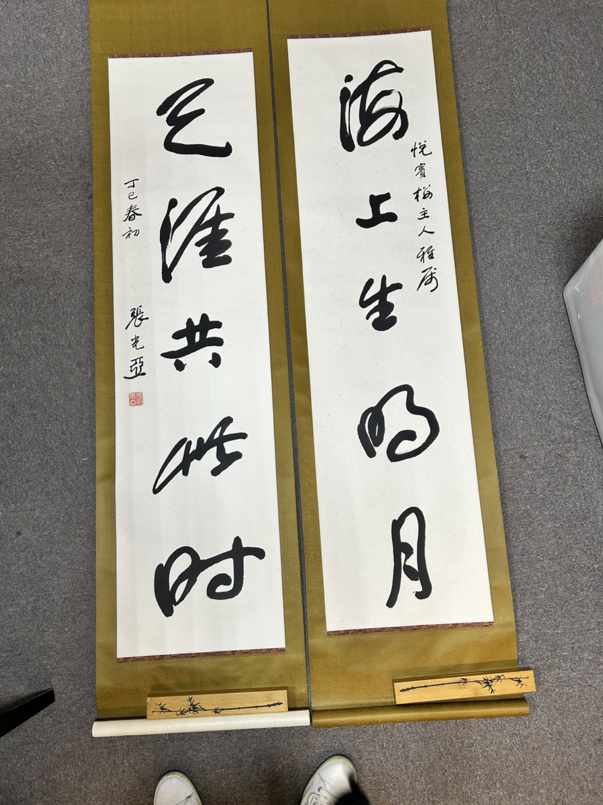 - 張光亞(1910-?)字靖波,陝西興平人。在書法方面,師古人碑帖、通各體,自成一格。從大陸到臺灣,張光亞一路追隨右老,在監察院擔任右老祕書。不僅是同鄉,張氏的草書風格近似右老「標準草書」形貌,筆致豐潤祥和,字形亦多圓曲,不露圭角。公餘之暇,張祕書經常陪同右老到臺北悅賓樓尋找一份家鄉味,嚐嚐北方菜。這件在悅賓樓主人王炳炎生日時,由右老作詩、張光亞題寫的書法,該是多麼風雅且珍貴的禮物!張光亞曾應邀參加國內外書展多次。歷任中國書法學會理事、標準草書研究會常務理事、考試院考試委員等職。