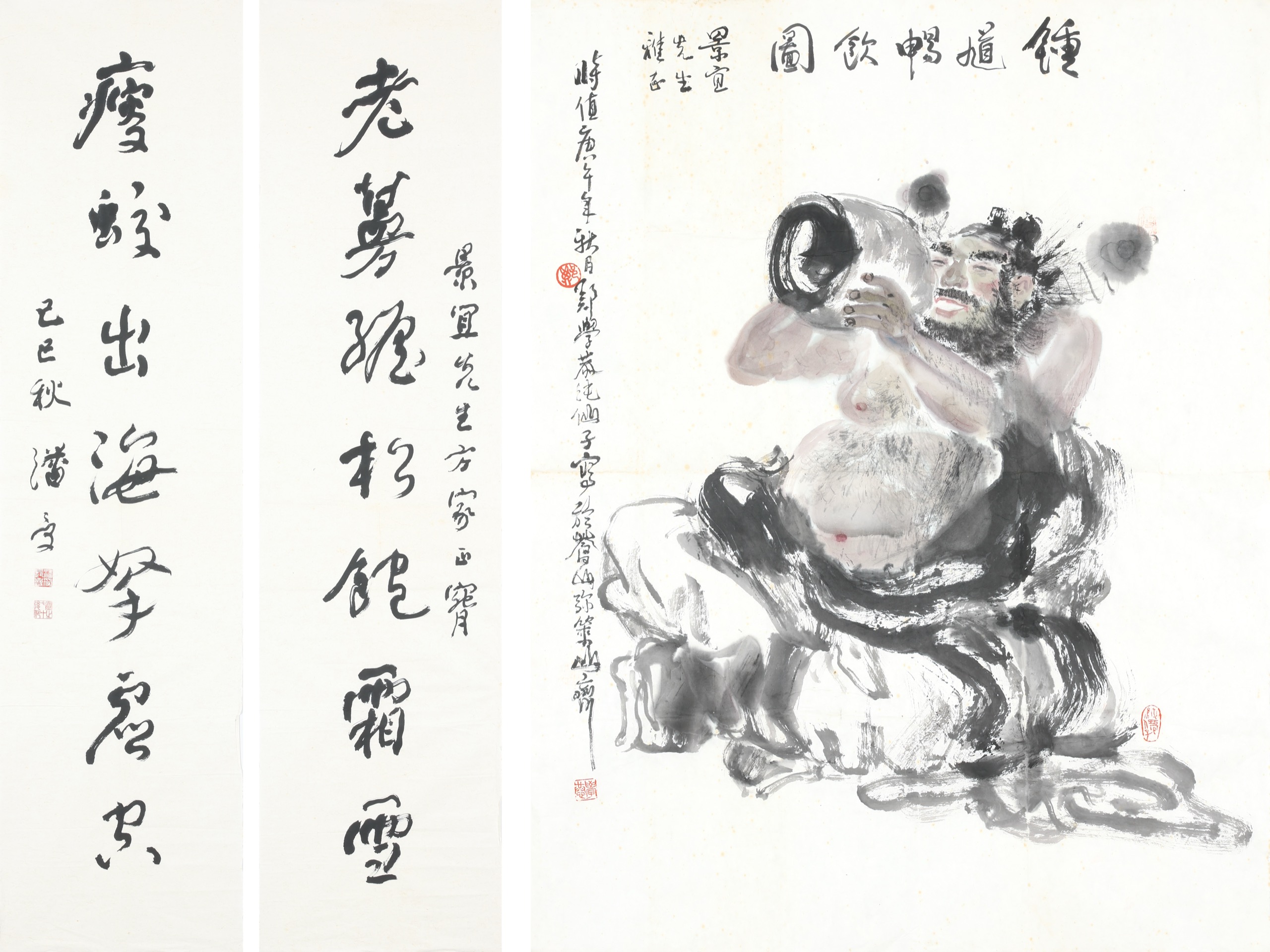 鍾馗暢飲、行書對聯(兩件一組)石景宜上款