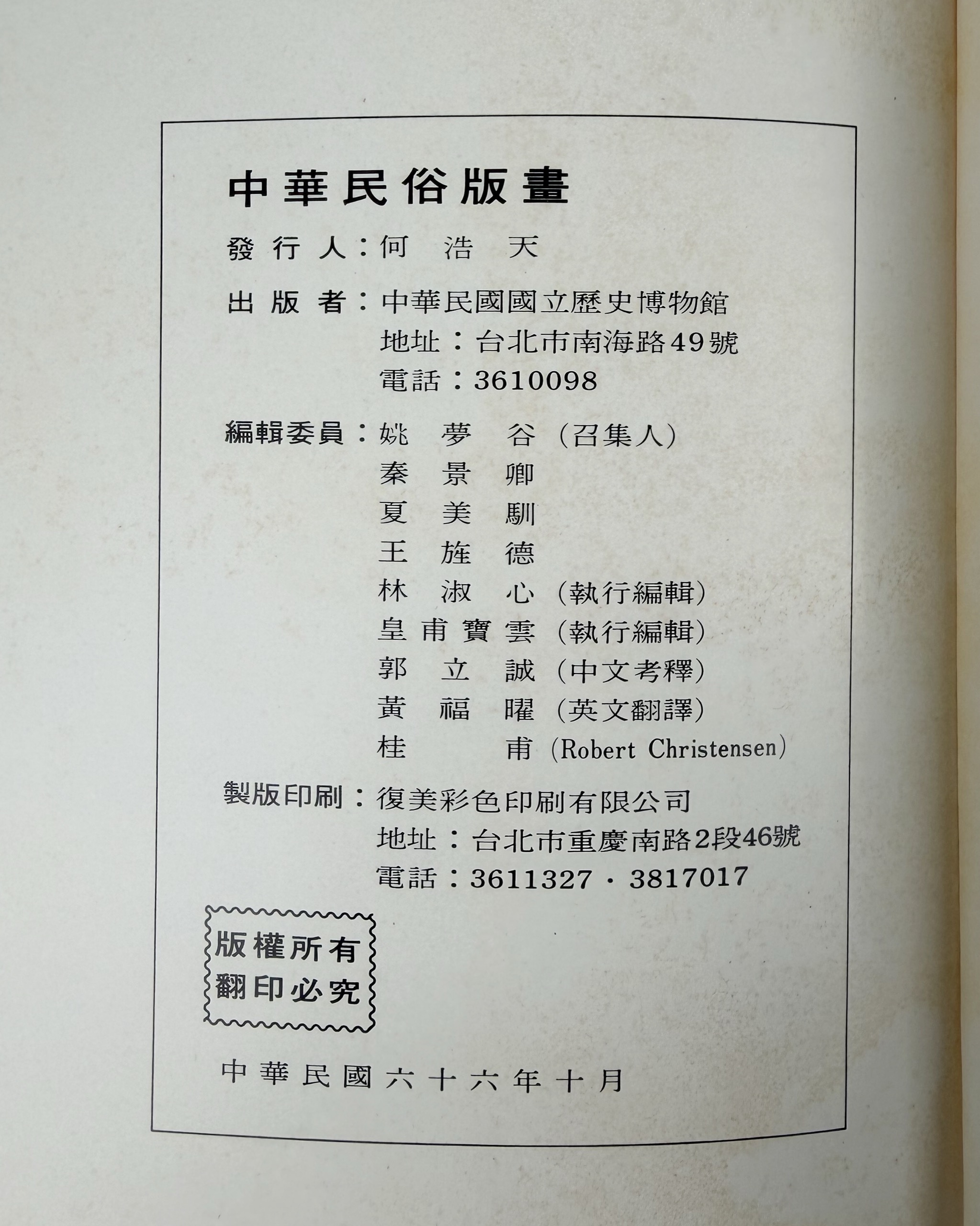 - 中華民俗版畫,雖屬神話傳統之產物,然淵源於尊天法祖崇禮尚義之悠久歷史文化,為形成我中華民族善良風俗之具體表現。於藝術上,亦有特殊之封域,其構圖、著色、與刻畫之線條,均充滿鄉土風格,純樸無華,由玄遠幽深之神話,與夫瑰麗璀璨之色彩,而構成之神秘之美,絕非一般繪畫所可比擬,尤以研究民俗學及民間藝術,價值至高。國立歷史博物館蒐藏之民俗版畫,為孫家驥先生所捐贈,內容至為豐碩,堪稱世界各博物館之冠。茲就各類中,甄選其有特色者,精印成帙,以供受好民俗藝術者之欣賞與研究。
