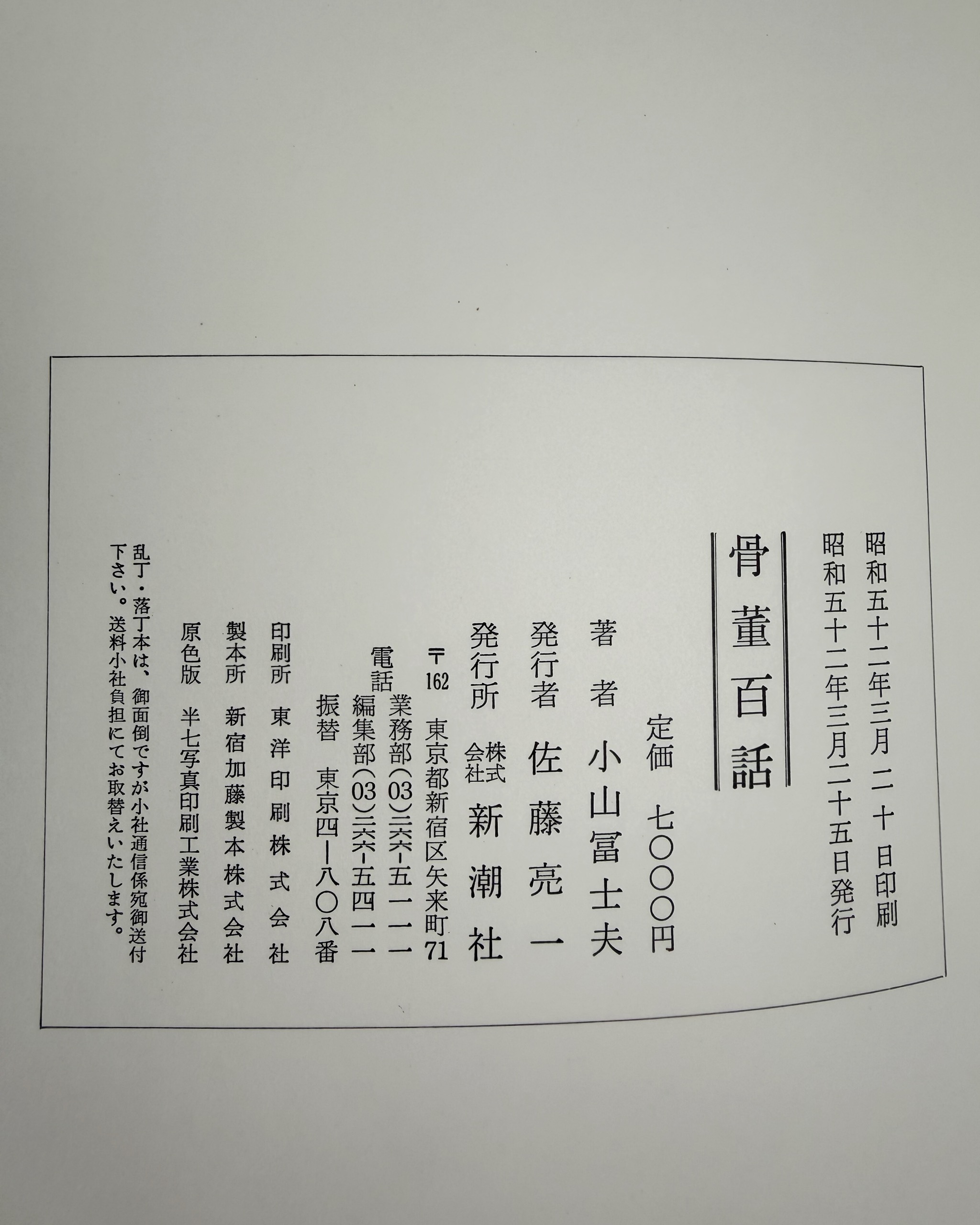 - 這是由陶藝家、陶瓷研究者及美術史家小山富士夫所著的一本書。內容收錄了一百則與古董相關的故事,如良寛的書法〈草庵雪夜〉、薩姆・弗朗西斯〈魯山人的臉〉、粉引茶碗、光悅的茶杓、高麗青瓷瓦、西域的陶俑、瓦硯等。