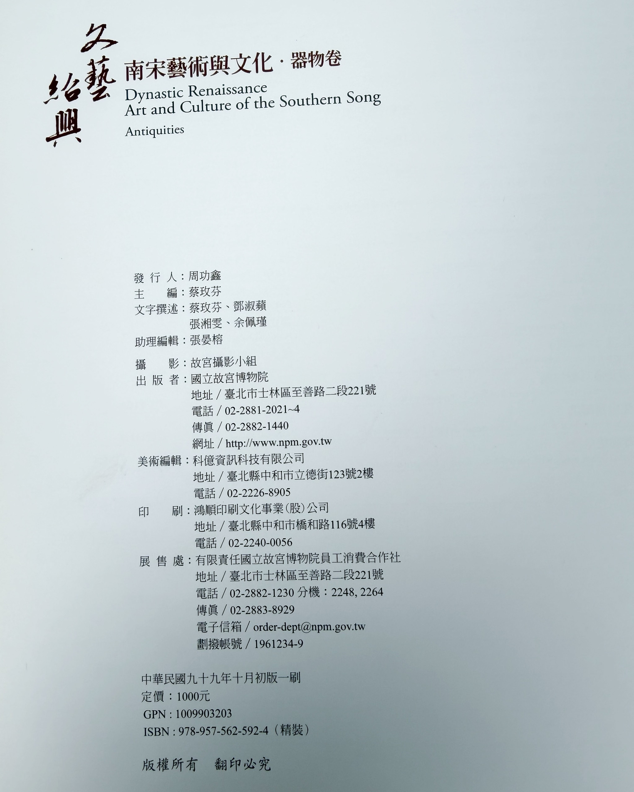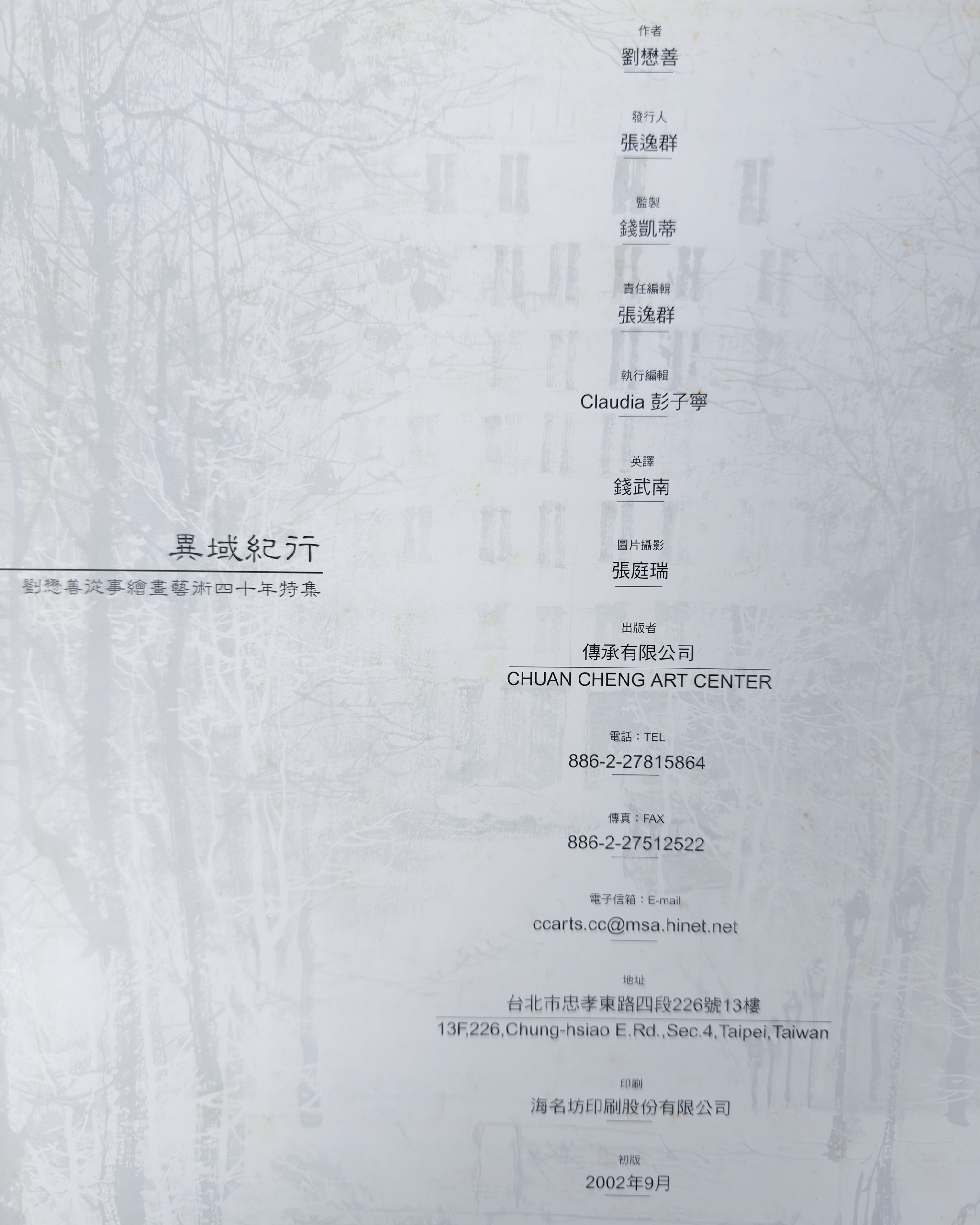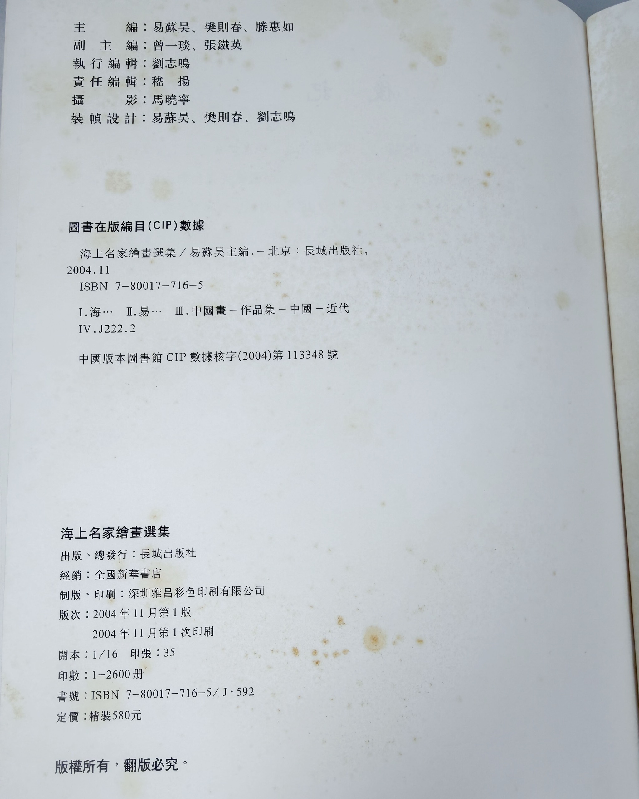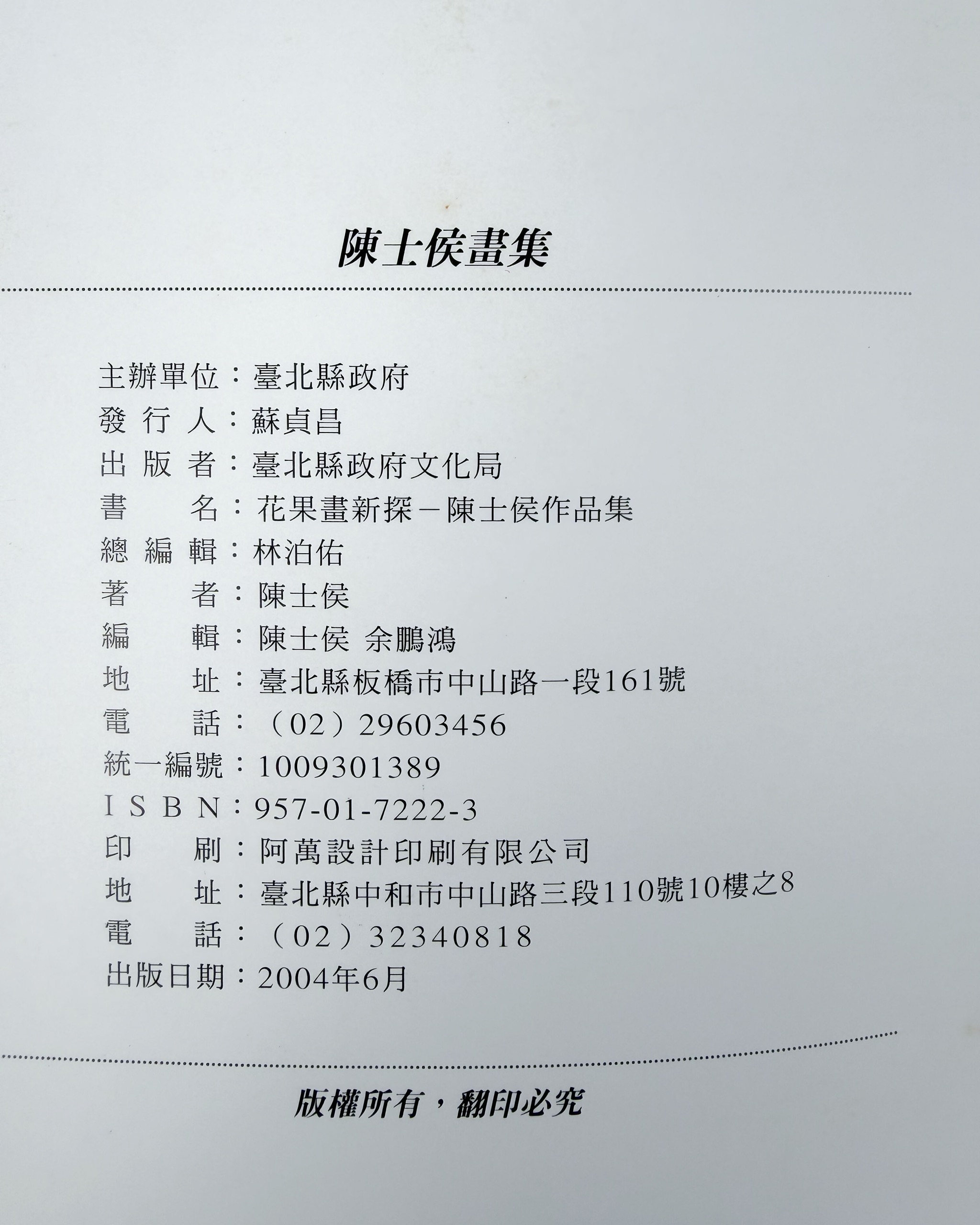 - 《Littleton & Hennessy Asian Art: Rocks》、《異域紀行:台北縣政府文化局畫集》、《南陳北崔:故宮博物院、上海博物館藏陳洪綬、崔子忠書畫集》、《海上名家繪畫選集 (貳)》、《徐悲鴻繪畫全集 3:中國水墨作品》、《文藝復興:南宋藝術與文化 (器物卷)》、《美哉斯石——海內外中國印石精品集》、《花果畫新探-陳士侯作品集(陳士侯畫集)》